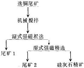透輝石和鈣鐵石榴石屬于弱磁性礦物,用磁選機能夠有效地進行分選。采用兩段濕式強磁選流程分選硅灰石獲得了較好的選礦效果。硅灰石選礦流程見下圖。