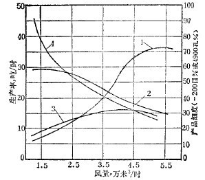 風量大,單位時間內(nèi)輸送的物料多,產(chǎn)量就高;但同時也由于風量大、風速高,磨礦產(chǎn)品也隨之變粗。風量與產(chǎn)量、產(chǎn)品粒度的關(guān)系如圖2 所示。