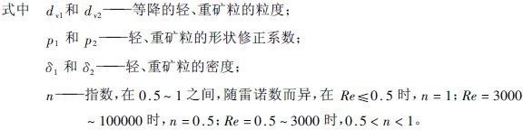 小密度顆粒的粒度與沉降末速度相等的大密度顆粒粒度之比值,稱為顆粒的等降比,其值大于1??梢愿鶕两邓俣认嗟鹊年P系求出。