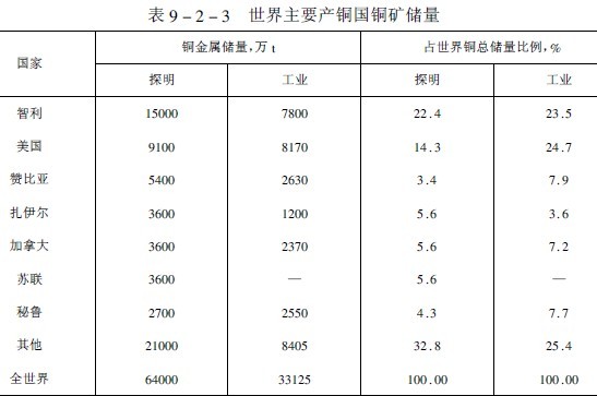 近年來(lái),世界各地陸續(xù)發(fā)現(xiàn)和開(kāi)發(fā)了一些新的礦床,擴(kuò)大了一些老礦床和利用了一些低晶位銅礦,世界銅礦儲(chǔ)量有所增長(zhǎng)。據(jù)美國(guó)礦山局1981年礦產(chǎn)要覽所載,世界已探明的銅金屬量為6.4億噸,其中正在開(kāi)采的礦山儲(chǔ)量為3億噸,正在建設(shè)的礦山儲(chǔ)量為5850萬(wàn)噸。銅礦主要集中在智利、美國(guó)、贊比亞、蘇聯(lián)和秘魯?shù)葒?guó)。智利、美國(guó)和贊比亞三國(guó)銅儲(chǔ)量約占世界總儲(chǔ)量的一半。世界銅礦儲(chǔ)量列于表9-2-3。