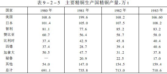 目前世界上采銅國(guó)家已有57個(gè),但資本主義世界主要礦產(chǎn)銅生產(chǎn)國(guó)約11個(gè)(表9-2-4),其中美國(guó)、智利、加拿大和贊比亞為四個(gè)較大產(chǎn)銅國(guó),約占資本主義世界礦產(chǎn)銅總產(chǎn)量的60%左右。除上述四國(guó)外,再加扎伊爾、秘魯、菲律賓和澳大利亞,約占資本主義世界礦產(chǎn)銅總量的83%。