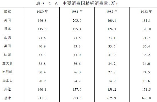 1983年,資本主義各國(guó)精銅消費(fèi)量達(dá)680萬(wàn)噸左右,與1982年的消費(fèi)量相當(dāng)(表9-2-6),其中美國(guó)增長(zhǎng)15萬(wàn)噸(9%),英國(guó)增長(zhǎng)0.9萬(wàn)噸(2.5%);加拿大增長(zhǎng)3.7萬(wàn)噸(25%)。其他各主要發(fā)達(dá)國(guó)家精銅的消費(fèi)量普遍下降。