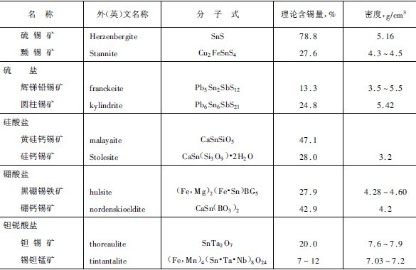 目前世界上已發現的錫礦物達60多種,包括氧化物、氫氧化物、硫化物、硫酸鹽、硅酸鹽、硼酸鹽、鉭鈮酸鹽以及天然金屬和合金。主要錫礦物及其特性列于表9-2-34。